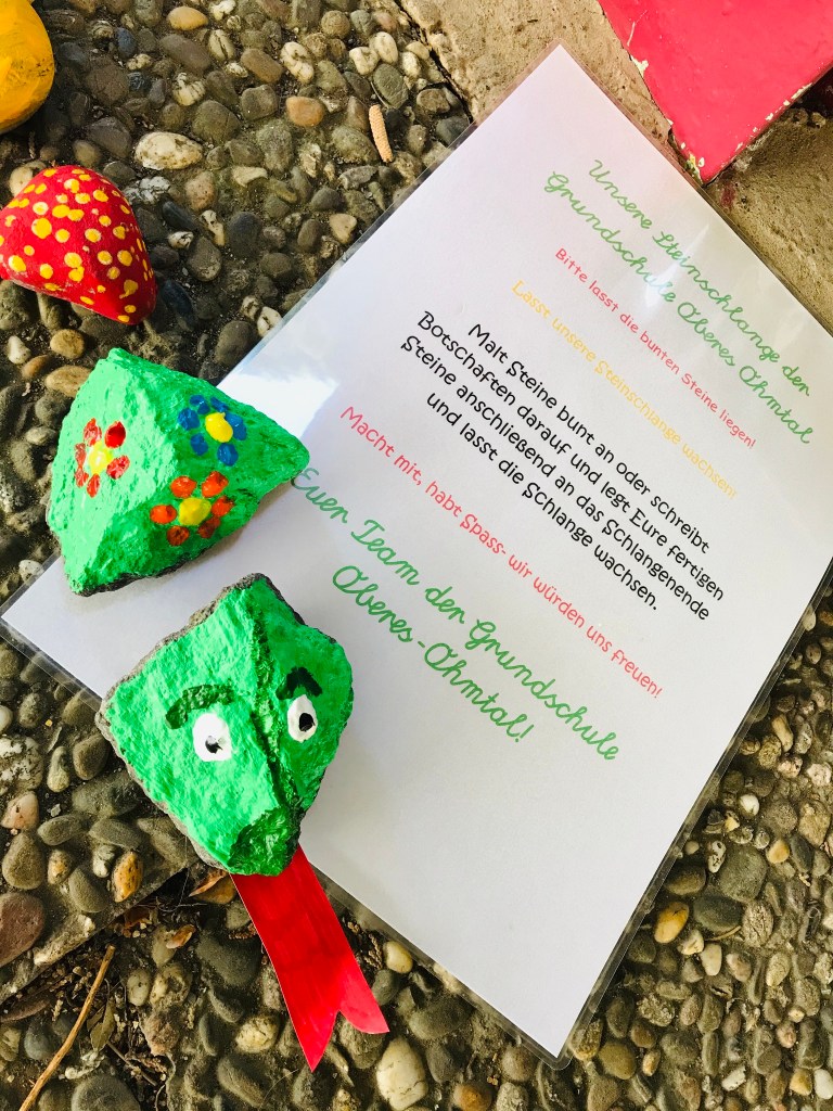 Die Steinschlange lebt seit einigen Tagen in unserem Pausengang und würde sich sehr freuen, wenn die Kinder sie noch weiter wachsen lassen.